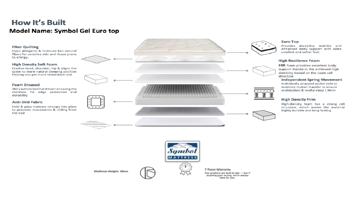 Experience the perfect blend of cooling comfort and tailored support with the Symbol Gel Faux EuroTop Mattress. Designed for modern sleepers, this mattress features a gel-infused EuroTop layer and a responsive pocket spring system, delivering balanced comfort that adapts to your body throughout the night.